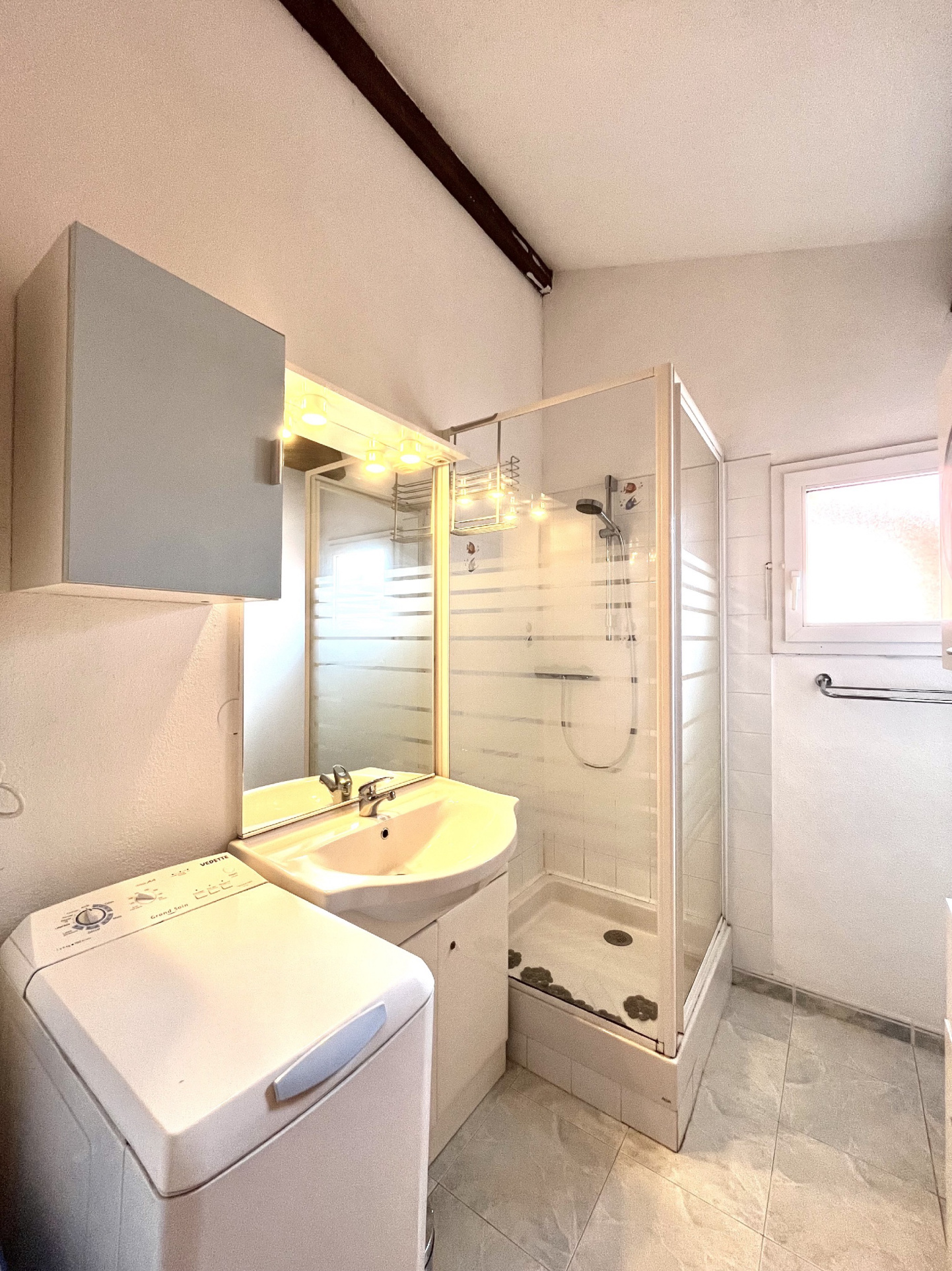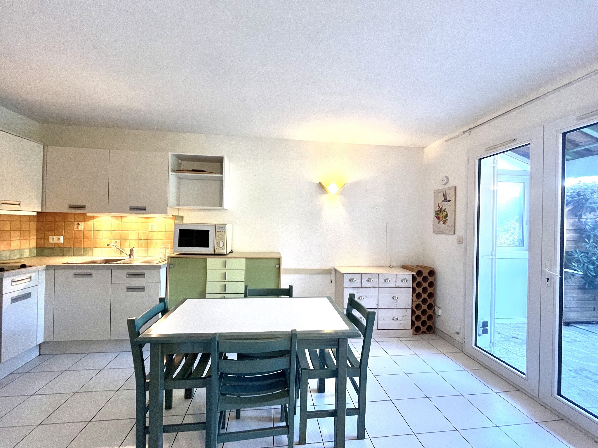Au rez-de-chaussée, elle s’ouvre sur une terrasse privative carrelée de 25 m², donnant accès à une agréable pièce de vie avec cuisine semi-équipée ouverte, un WC indépendant ainsi qu’un placard de rangement.