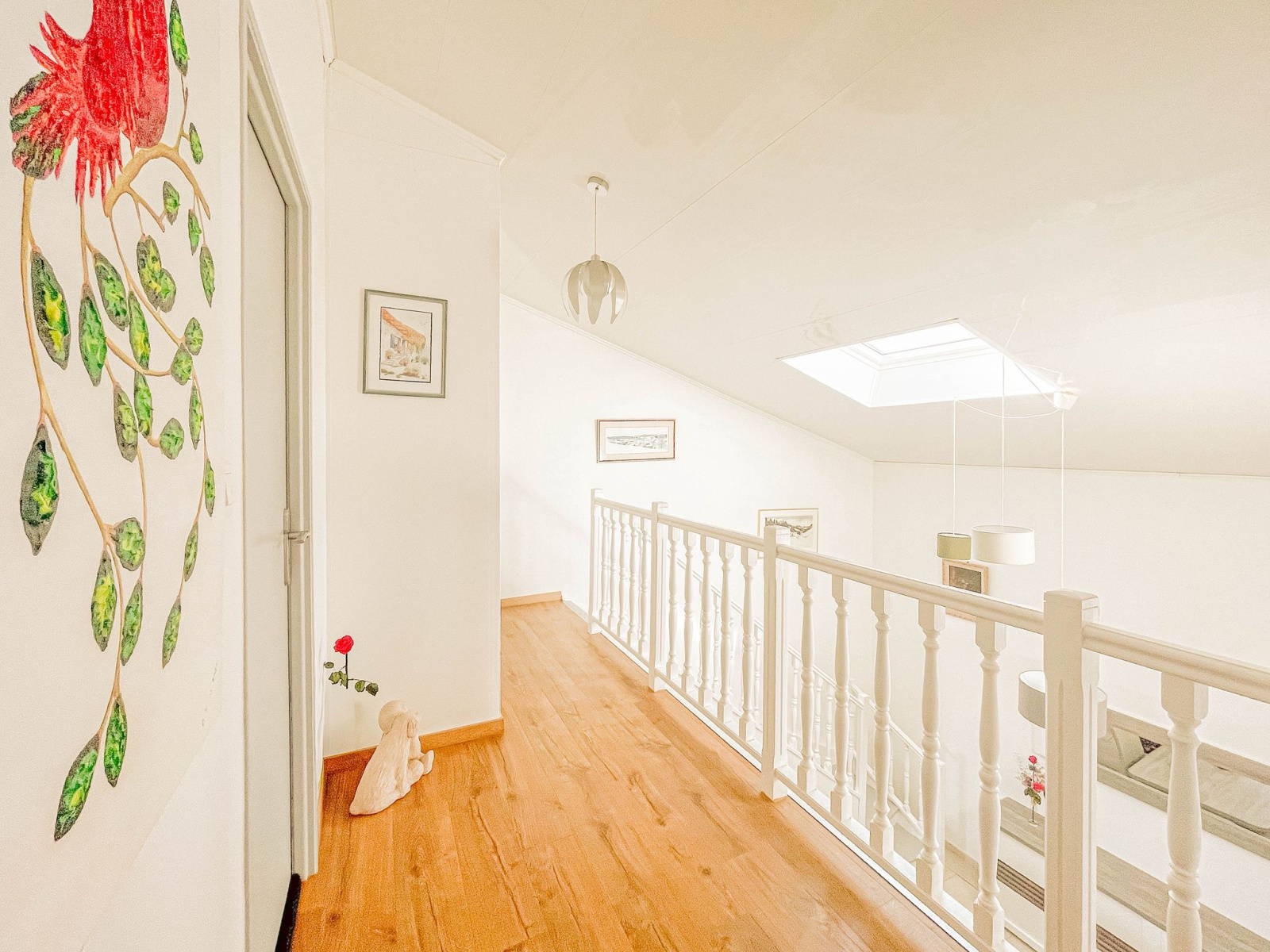 À l’étage : Une belle mezzanine lumineuse dessert deux chambres d’environ 12m², une salle d’eau carrelée et un WC indépendant.