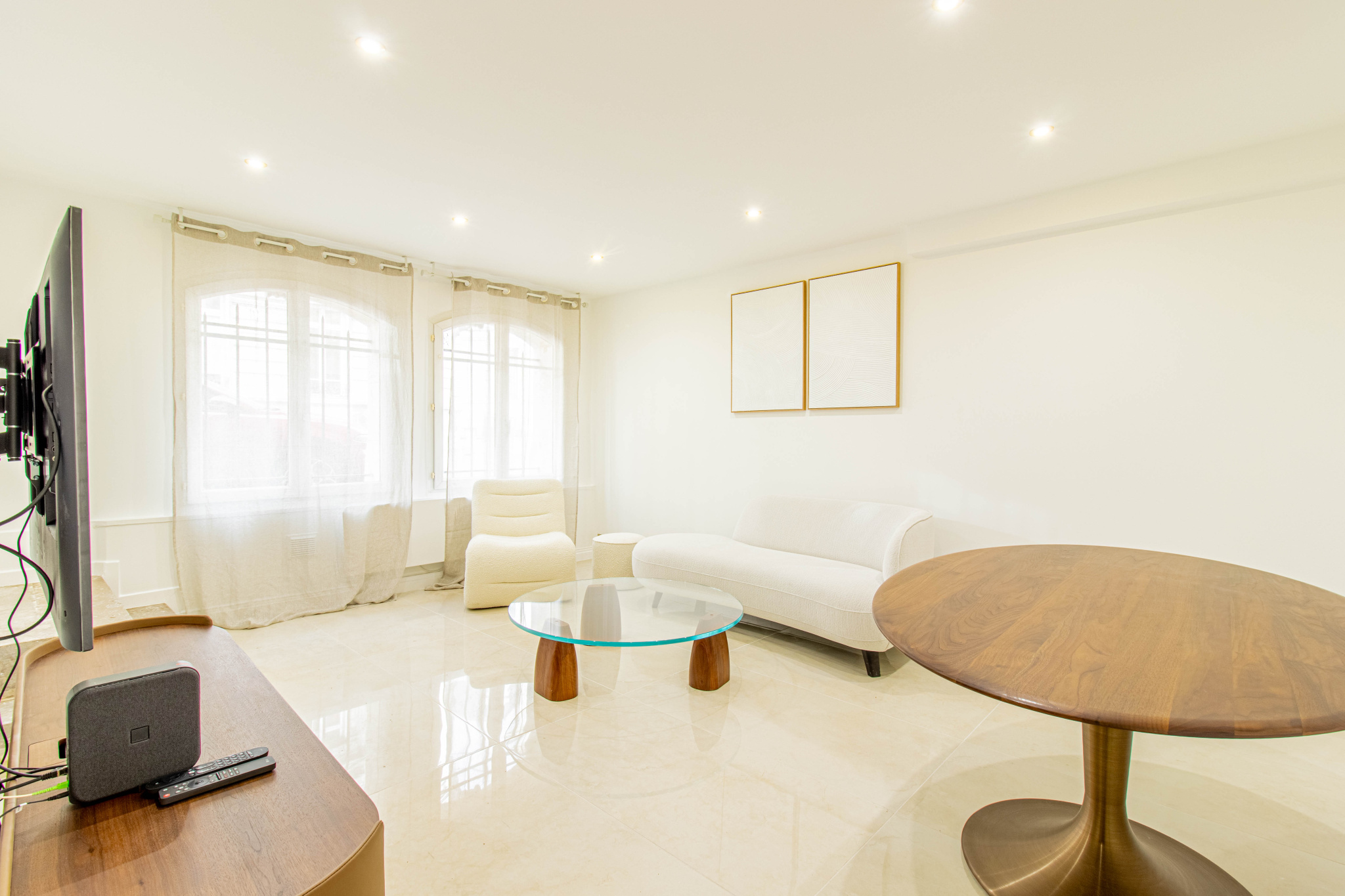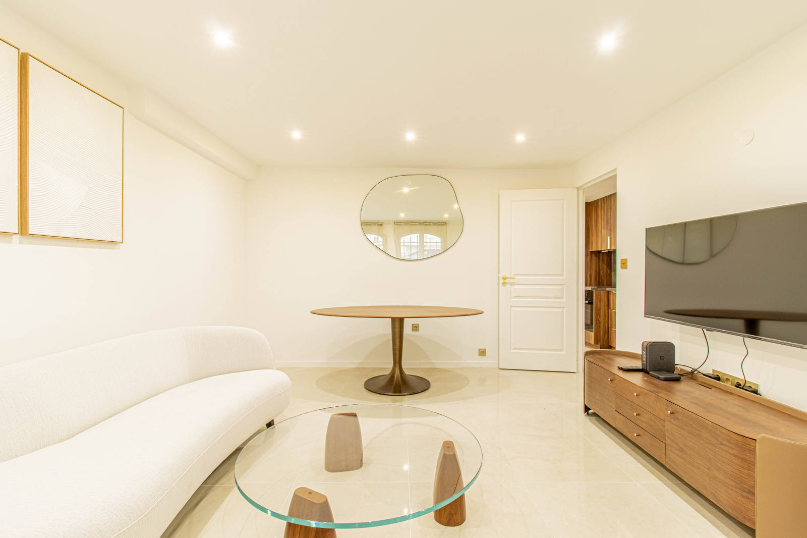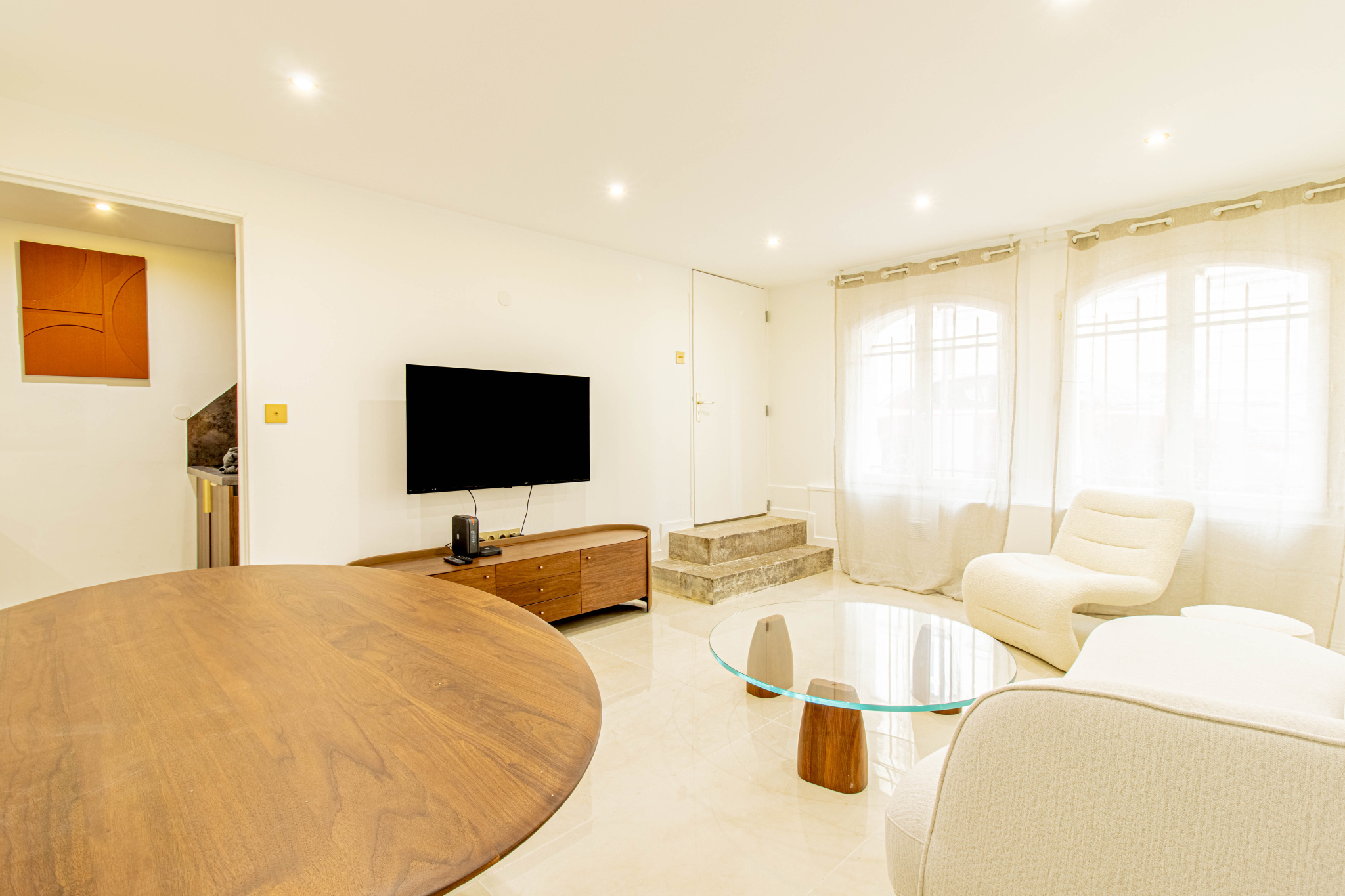 Dès l’entrée, vous découvrirez un salon séjour spacieux et particulièrement cosy. L’ensemble bénéficie d’un ameublement de goût et d’une atmosphère chaleureuse, sublimée par l’utilisation de bois noble, notamment du noyer, apportant élégance et caractère à l’espace de vie.