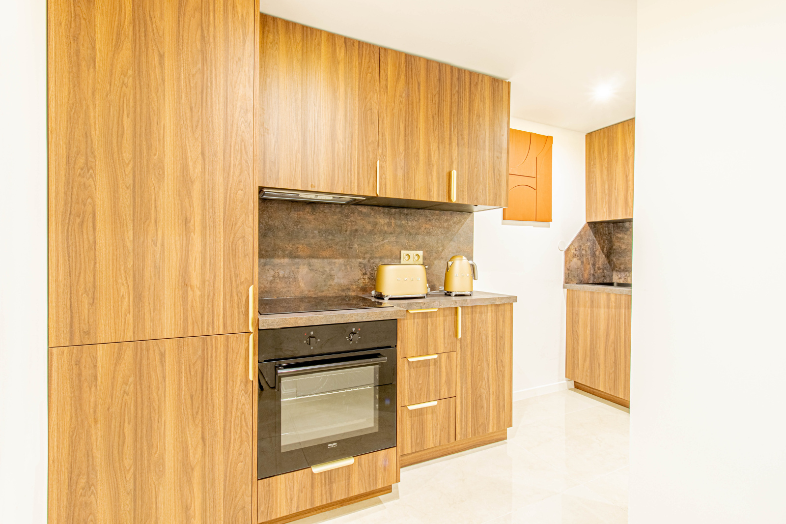 La cuisine, entièrement équipée, offre des prestations modernes et fonctionnelles idéales pour un confort quotidien. Les éléments de cuisine ont également été réalisés en noyer afin de rappeler harmonieusement l’espace de vie et renforcer la cohérence esthétique de l’ensemble.