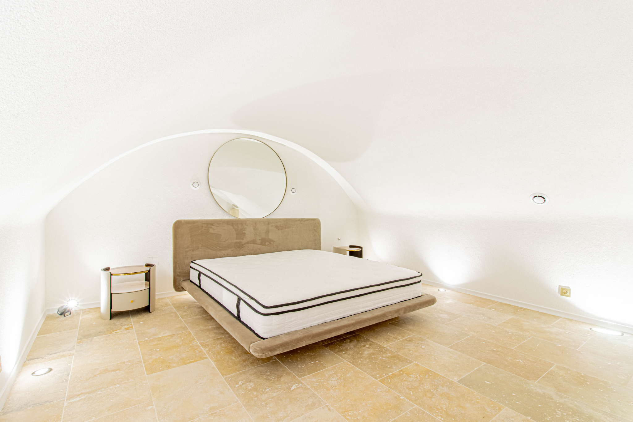 En souplex, une ancienne cave a été totalement repensée et rénovée. Elle est équipée de cinq bouches de ventilation (VMC) garantissant une ventilation optimale et l’absence totale d’humidité. Cet espace unique a été transformé en une très grande chambre avec literie d’hôtellerie, éclairage par spots au sol et une ambiance particulièrement cosy.