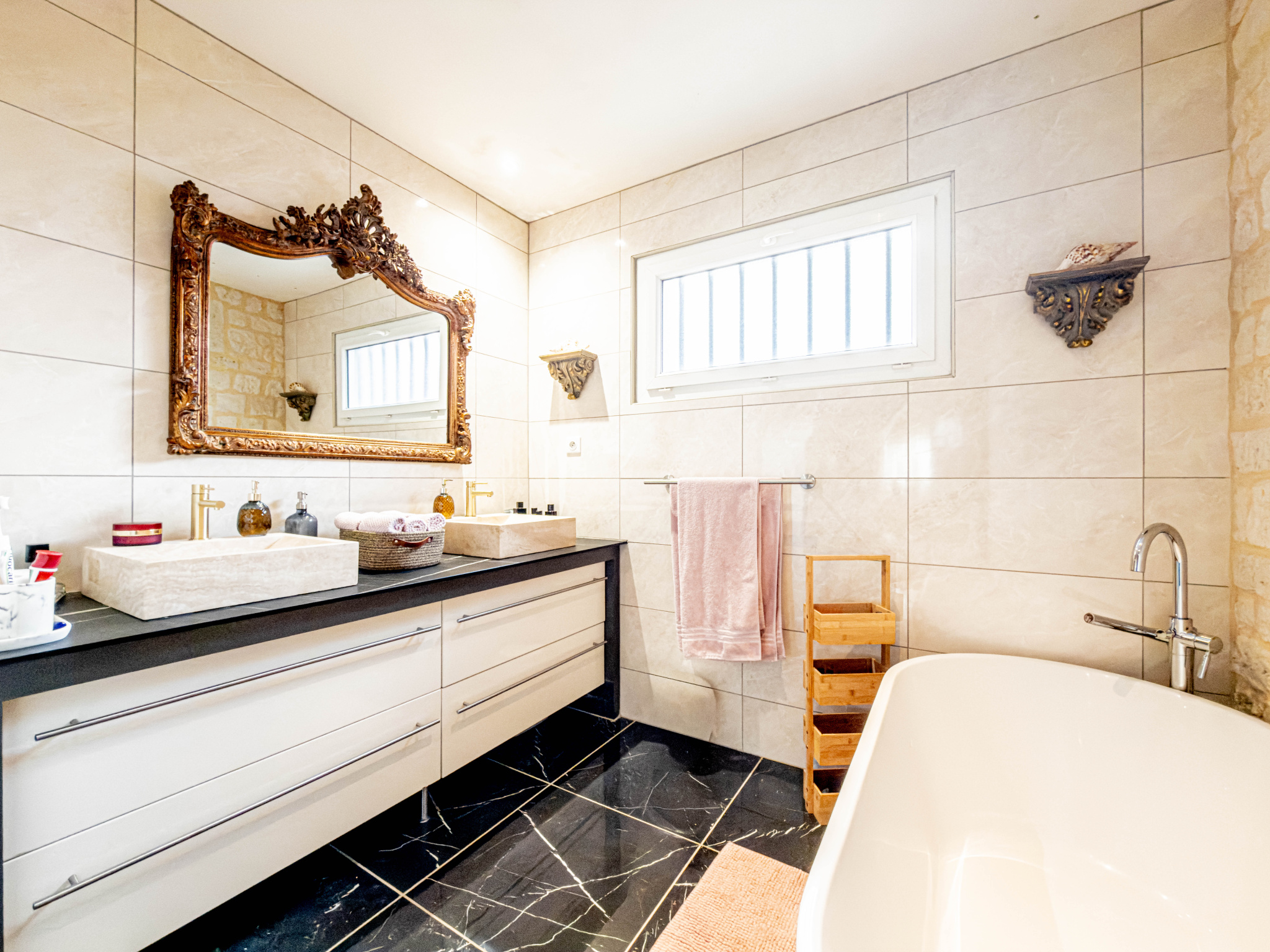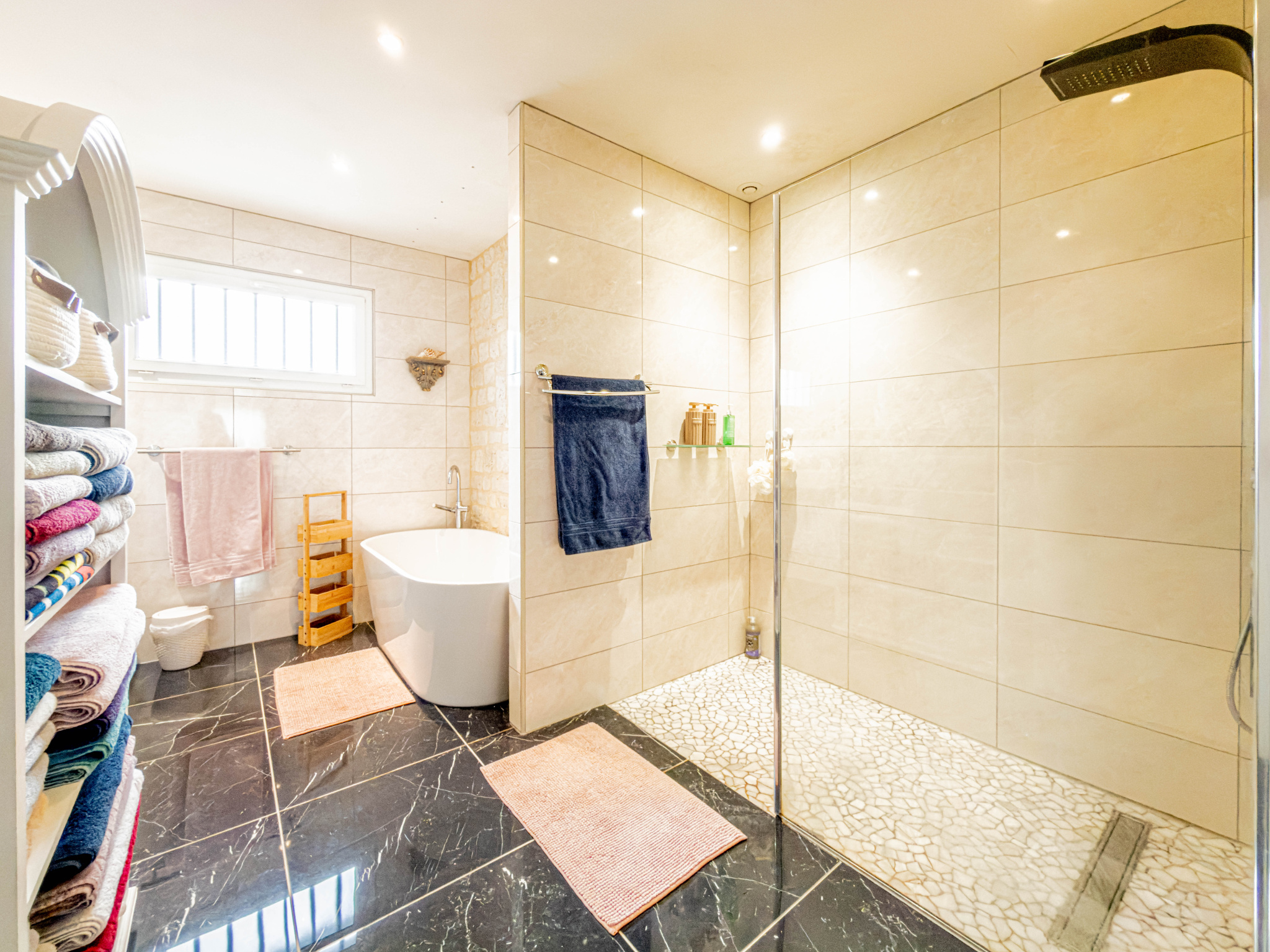 - Une salle de bain équipée d’une douche et d’une baignoire